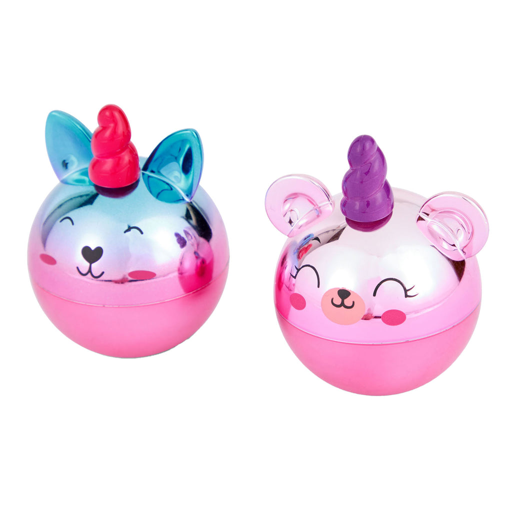 Houd je lippen zacht en soepel met de Create it! Lippenbalsem in boxset! Deze set bevat 2 schattige lippenbalsems in de vorm van ronde ballen, elk met een schattig beer- en kattengezichtje.
