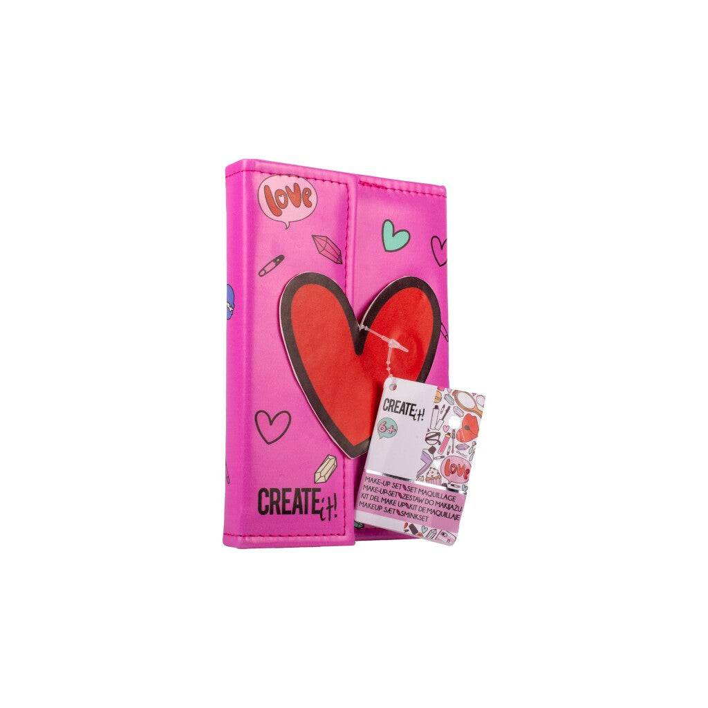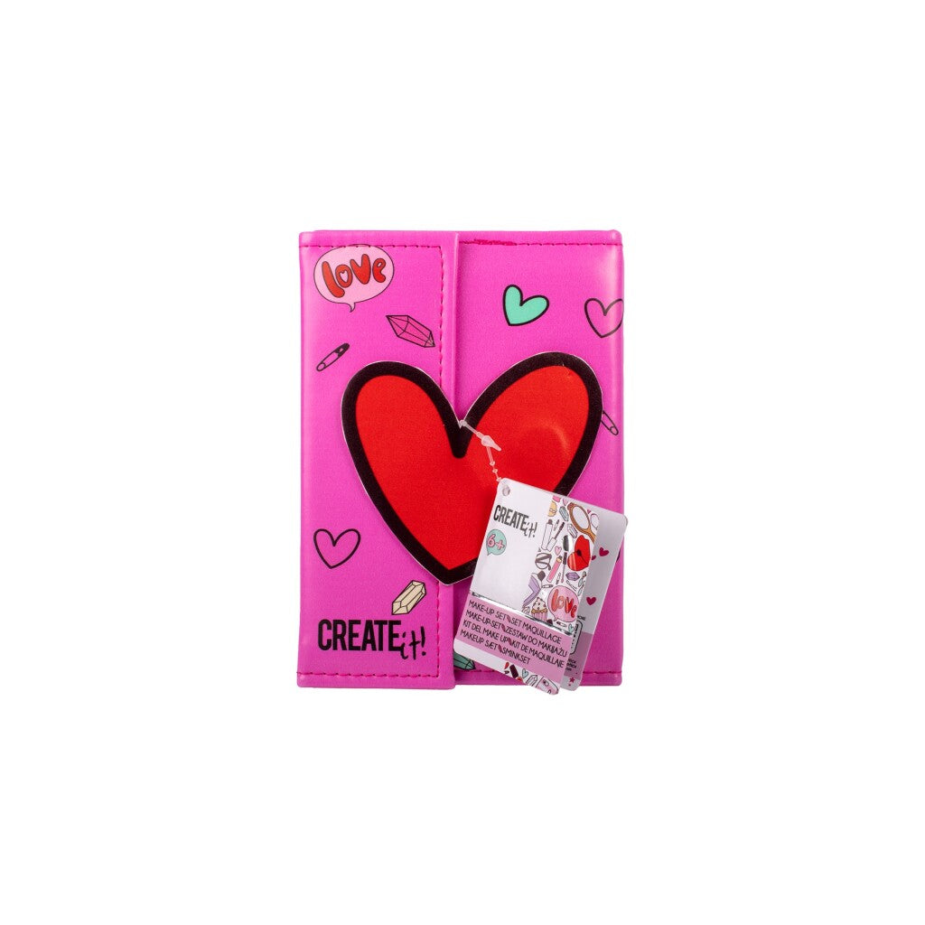 Create it! Make-up met magneetsluiting. Het boek is 17 x 12 cm groot en bevat een spiegel, kwastjes 4 kleuren blush, 9 kleuren oogschaduw en 8 geurende kleuren voor lippen en ogen. Geschikt vanaf 6 jaar.