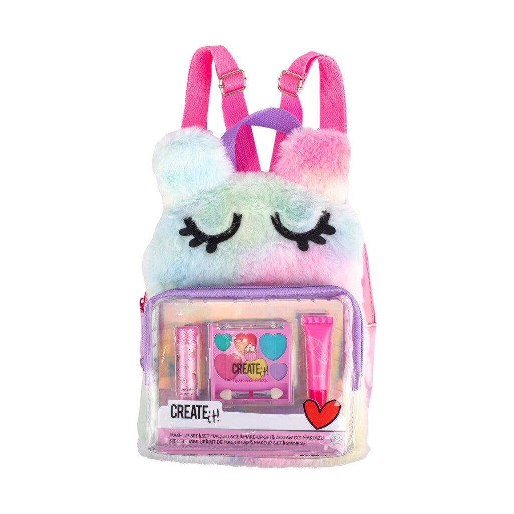 Hou je ervan om met make-up te spelen? Dan is dit de perfecte rugzak om overal mee naartoe te nemen. De Create it! Make-up Set in Rugzak is multifunctioneel. De pluizige rugzak met een schattig gezicht helpt je al je make-upbenodigdheden op één plek te bewaren.