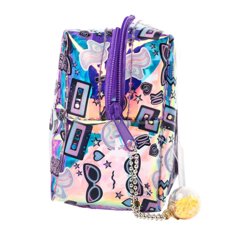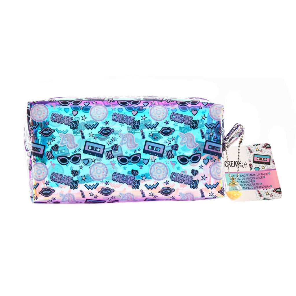 Create It! Make-Up Tasje. Het doorzichtige tasje van kunststof heeft een vrolijk design met bliksemschichten en sterretjes of cassettebandjes en zonnebrillen.