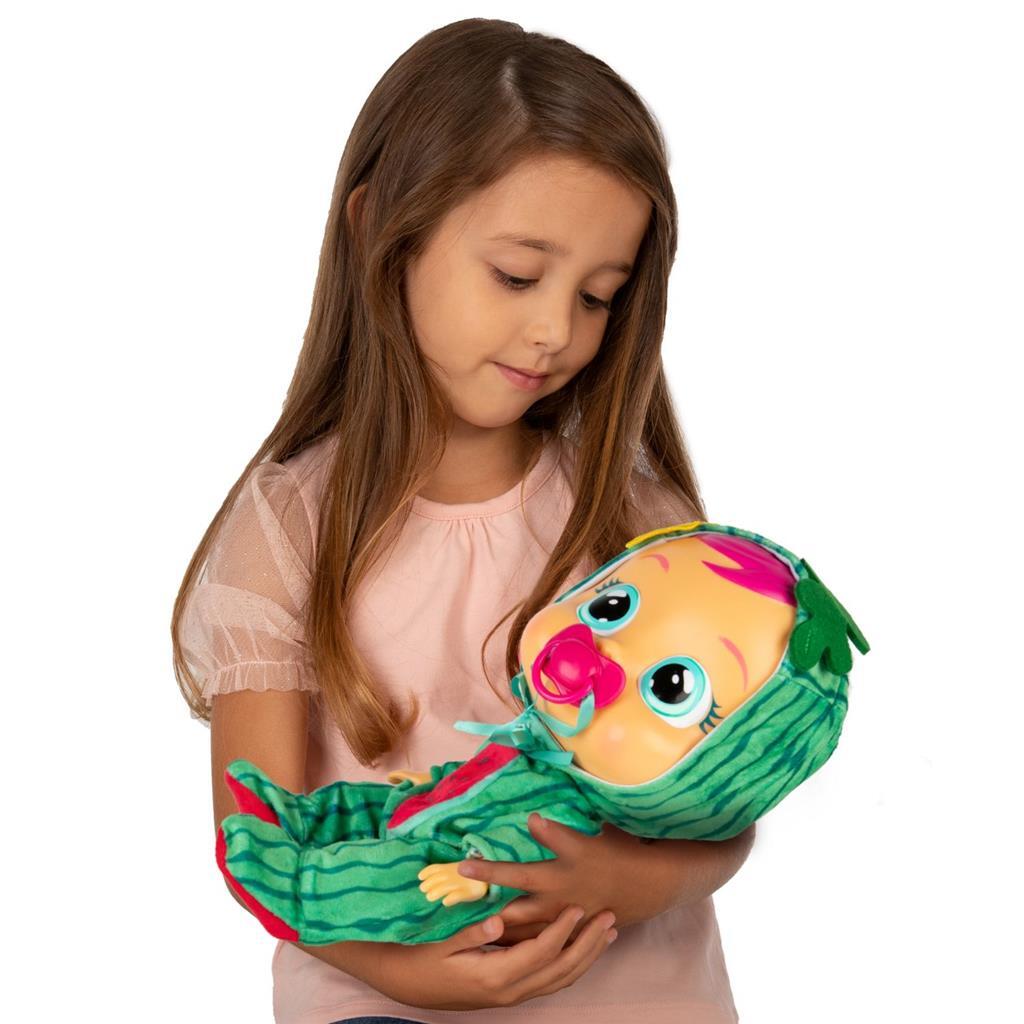 Cry Babies Tutti Frutti Melis eenspeciale Cry Baby met fruitige onesies! Mel draagt een onesie van een meloen en ze ruikt ook naar haar favoriete fruit! En wat ligt ze lekker te slapen met een speentje in haar mond. Maar pas op, zodra het speentje uit haar mond valt, begint ze echte tranen te huilen! Ze zal schattige huilgeluidjes maken, totdat ze gekalmeerd wordt met haar speentje. Batterijen meegeleverd.Geschikt voor kinderen vanaf 18 maanden.