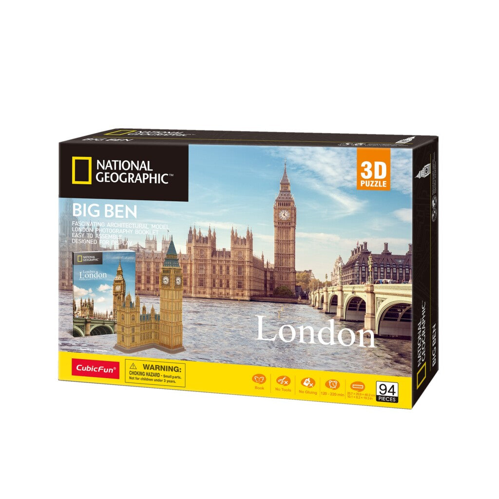 Cubic Fun National Geographic 3D puzzel Big Ben, één van de meest in het oog springende bezienswaardigheden in Londen. Hoogte van het in elkaar gezette bouwwerk: 49,2 cm. Bestaat uit 94 losse onderdelen, die zonder gereedschap of lijm in elkaar gezet kunnen worden. Inclusief geïllustreerde handleiding.