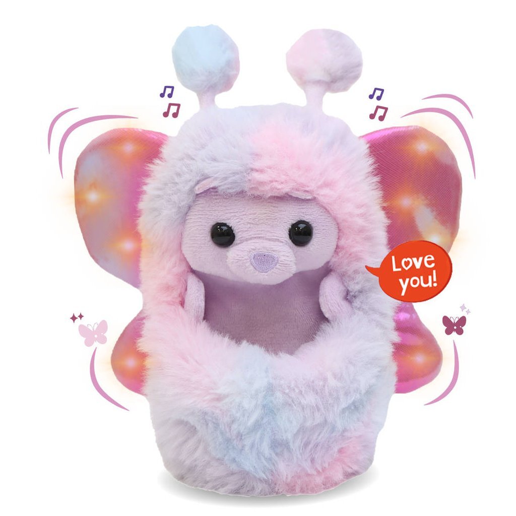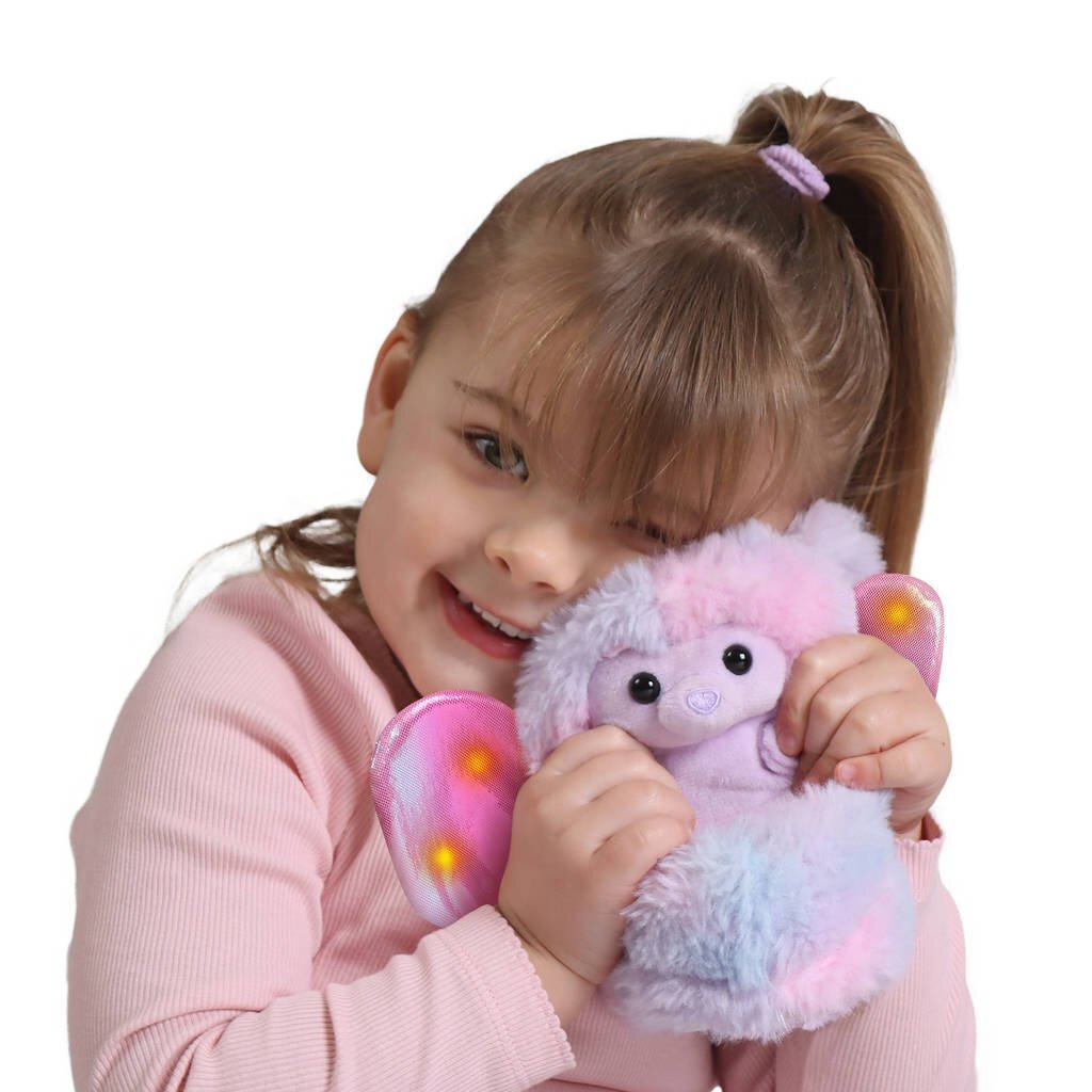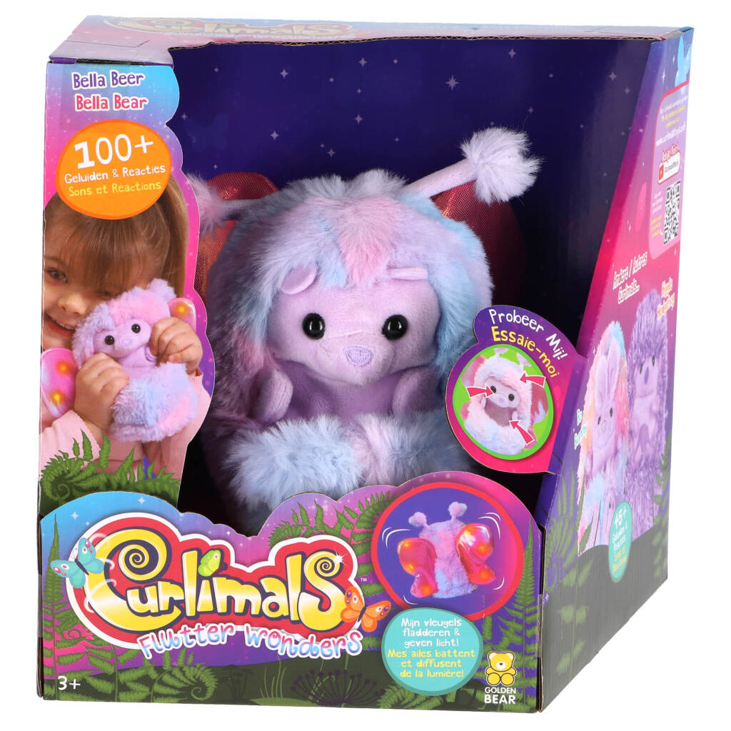 Ergens in het bos ligt verborgen in een boom, een klein, opgerold wezentje met vleugels. Het is Bella Beer, het liefste fladderende wezentje dat je ooit zult ontmoeten. Bella ziet eruit als een zacht bolletje, maar als je haar wakker maakt, zal ze zich uitrollen en haar lieve gezichtje laten zien. Bella wil graag met je spelen, tegen je praten en je kusjes geven. Na een duik in een glinsterende vijver kreeg Bella glinsterende vleugels die fladderen en licht geven! Bella is voorzien van wel 100+ geluidjes en reacties. Streel haar neusje en ze zal niezen en zich weer oprollen. Bella is de liefste knuffel die er is! Batterij informatie: 3 x AAA batterijen (meegeleverd). De batterijen dienen voor de 'Try Me' functie en kunnen mogelijk zwak zijn. Leeftijdsindicatie: 3 jaar+.