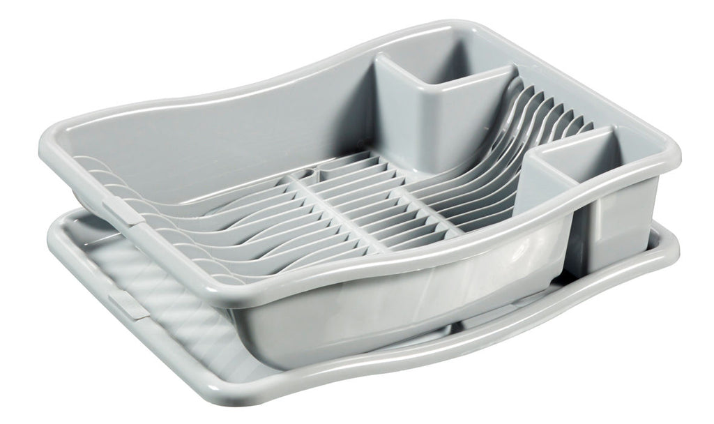 Curver afdruiprek van lichtgrijs kunststof, met een formaat van 38 x 29 x 8,5 cm. 2 speciale vakjes voor bestek. Plateau onder het rek voorkomt het morsen van water op het aanrecht.