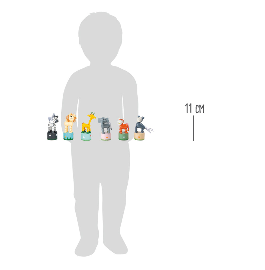 Nu wordt het wiebelig! Door tegen de onderkant van dit speeltje te duwen komen deze vrolijke Afrikaanse dieren tot leven. Ze kunnen veel gekke bewegingen maken en geen twee bewegingen zijn gelijk, afhankelijk van hoe en waar de basis wordt ingedrukt. Het is enorm wiebelplezier voor spelen, verzamelen en cadeau geven! Per 6 stuks.