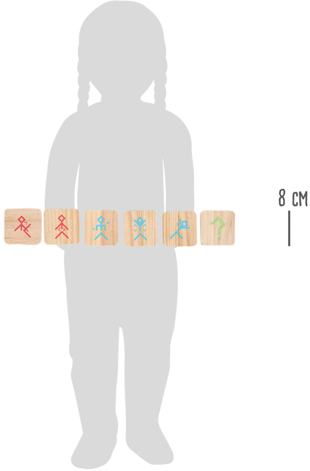 Laten we dansen! Bij dit dansspel, gemaakt van FSC® 100% gecertificeerd hout, tonen de onthulde kleine houten plaatjes de dansbewegingen die gedaan moeten worden. Deze "bewegingen" moeten worden uitgevoerd door de speler wiens beurt het is, en vervolgens moeten alle bewegingen in de onthulde reeks worden herhaald door alle andere spelers. Dit is een spel dat op speelse wijze lichaamsbewustzijn, bewegingspatronen en vindingrijkheid traint. Iedereen wordt een dansende ster met dit spel!