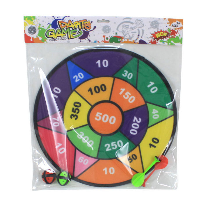 Klittenband dartbord. Inhoud: Dartbord, 2 balletjes en 2 dartpijltjes.