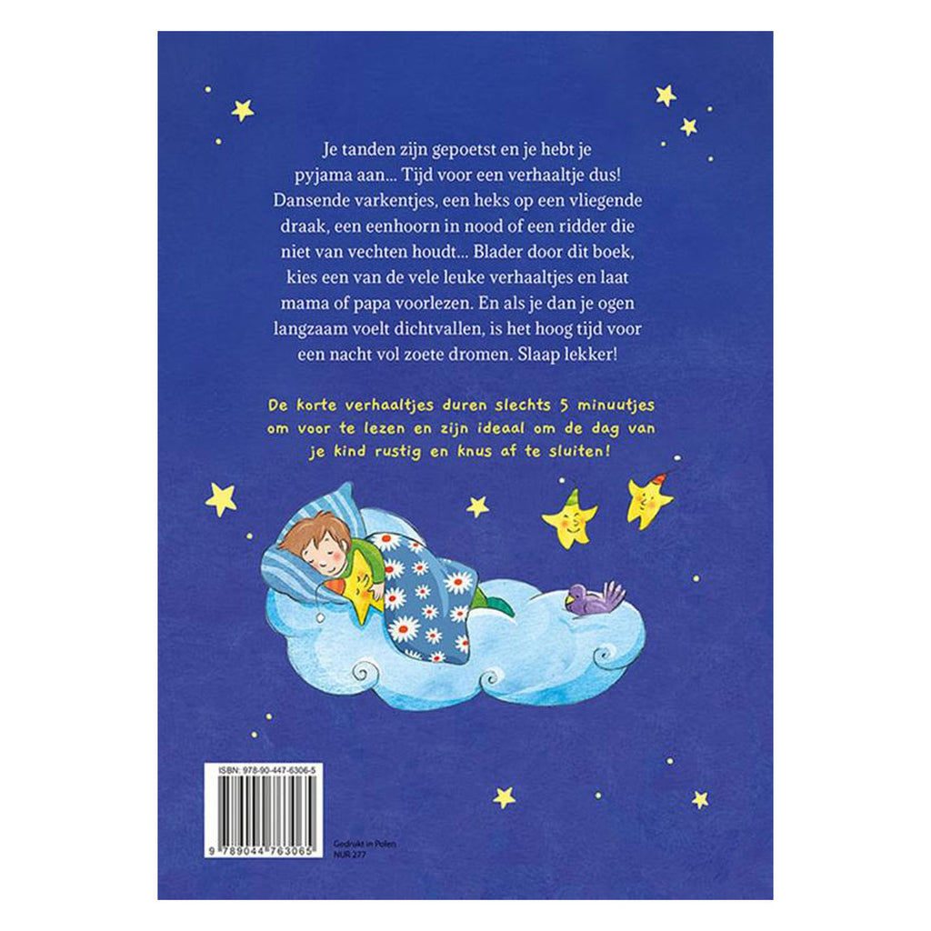 In dit prachtige bedtijdboek staan een heleboel leuke verhalen om bij weg te dromen. Dansende varkentjes, een heks op een vliegende draak, een eenhoorn in nood of een ridder die niet van vechten houdt...… Blader door dit boek, kies een van de vele leuke verhaaltjes en geniet samen met je kind van het voorleesmoment. De verhaaltjes zijn kort en duren slechts 5 minuten om voor te lezen. Ideaal om de dag rustig en knus af te sluiten.