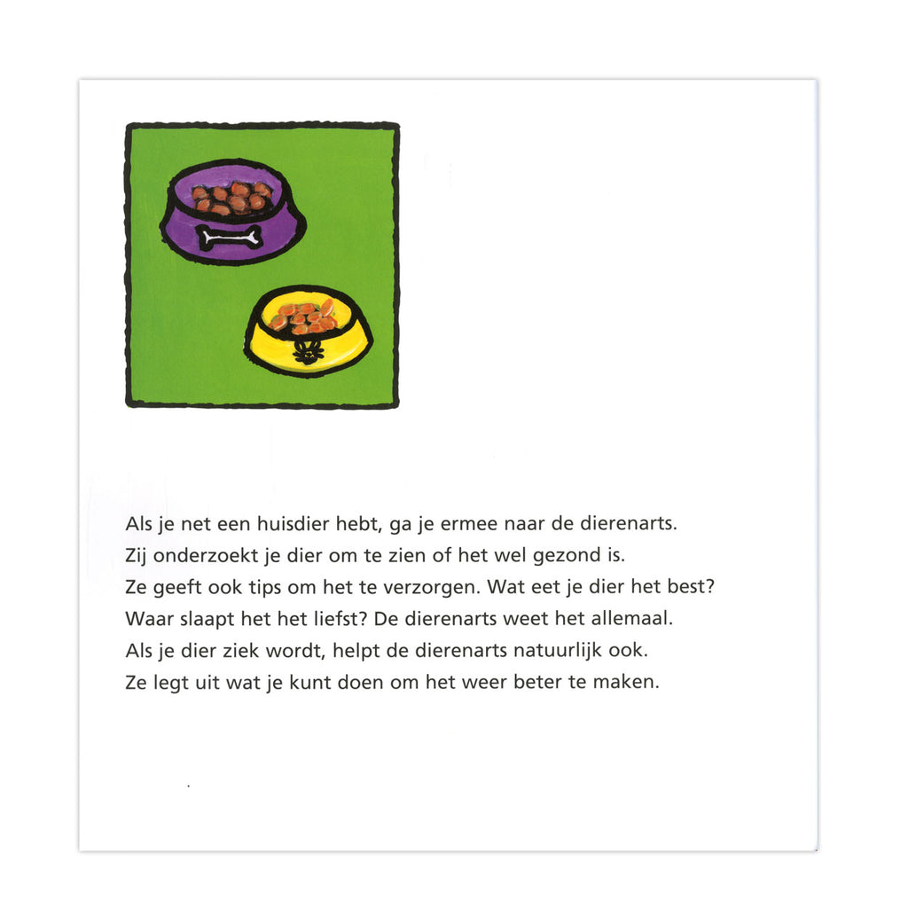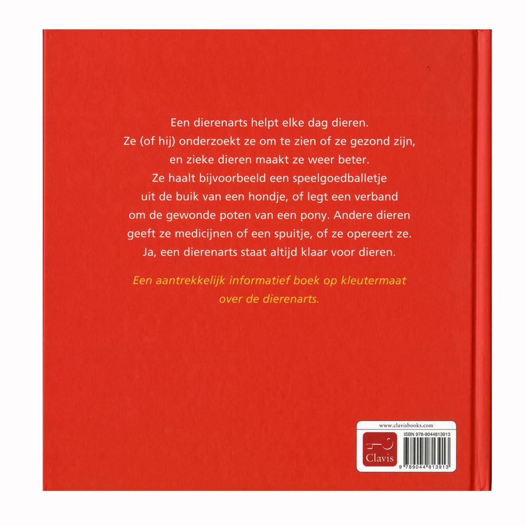 Een dierendokter helpt elke dag dieren.Hij onderzoekt ze om te zien of ze gezond zijn,en zieke dieren maakt hij weer beter.Hij haalt bijvoorbeeld een speelgoedballetjeuit de buik van een hondje, of legt een verbandom de gewonde poten van een pony. Andere dierengeeft hij medicijnen of een spuitje, of hij opereert ze.Ja, een dierenarts staat altijd klaar voor dieren.