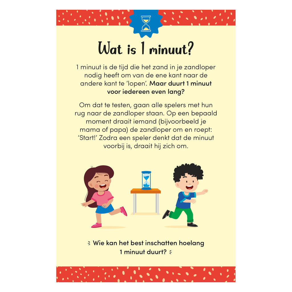 In deze leuke doos van Deltas zitten een heleboel kaarten met originele opdrachten en spelletjes. Maar het zijn geen gewone spelletjes! Je krijgt voor elke activiteit namelijk slechts 1 minuut de tijd! Wie kan in 1 minuut de meeste koprollen maken? Wie vindt in 1 minuut de meeste rijmwoorden op het woord 'schoen'? Of wie maakt de langste ketting met paperclips? Om de tijd goed in de gaten te kunnen houden, zit er een zandloper bij in de doos die precies 1 minuut loopt. Dus draai de zandloper om en… START! Ideaal voor kinderfeestjes.