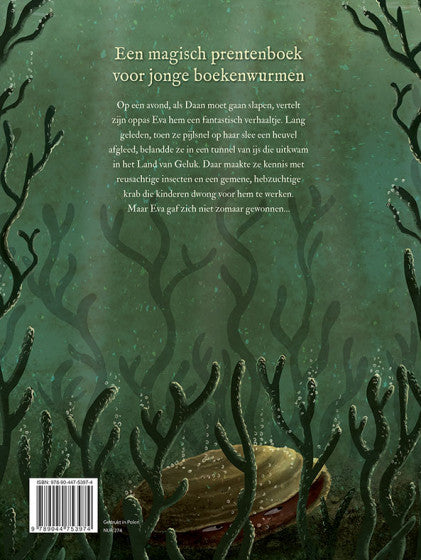 Op een avond, als Daan moet gaan slapen, vertelt zijn oppas Eva hem een fantastisch verhaaltje. Lang geleden, toen ze met grote snelheid op haar slee een heuvel afgleed, belandde ze in een tunnel van ijs die uitkwam in het Land van Geluk. Daar maakte ze kennis met enkele bijzondere insecten en een gemene, hebzuchtige Krab die kinderen dwong voor hem te werken. Maar Eva gaf zich niet zomaar gewonnen...