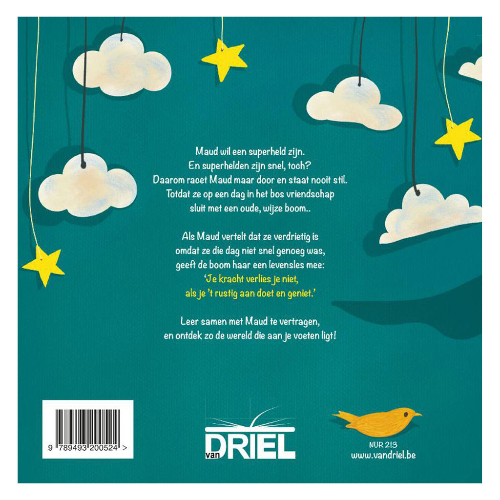 Maud wil een superheld zijn. En superhelden zijn snel, toch? Daarom racet Maud maar door en staat nooit stil. Totdat ze op een dag in het bos vriendschap sluit met een oude, wijze boom.. Als Maud vertelt dat ze verdrietig is omdat ze die dag niet snel genoeg was, geeft de boom haar een levensles mee: ‘Je kracht verlies je niet, als je ’t rustig aan doet en geniet.’ Leer samen met Maud te vertragen, en ontdek zo de wereld die aan je voeten ligt!