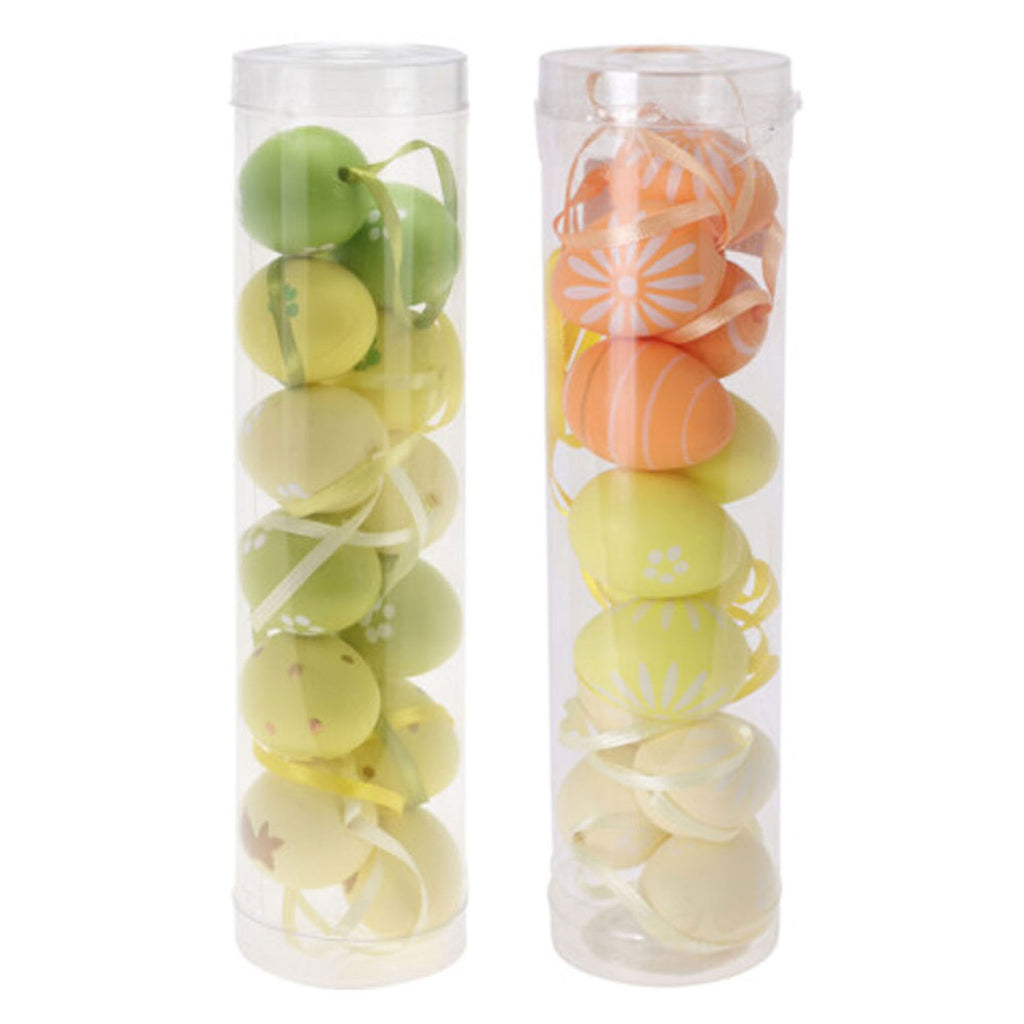 12 stuks decoratieve eieren in verschillende kleuren. Afmeting: 4 cm groot. Inclusief lint om ze op te hangen.