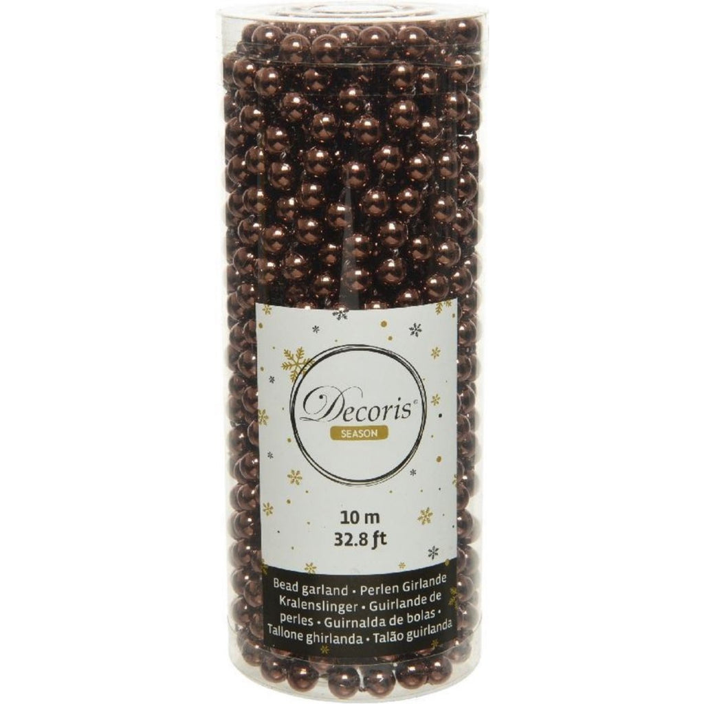 Decoris kerstversiering kralenslinger. Op verschillende manieren als kerstversiering te gebruiken, bijvoorbeeld in de kerstboom. De kralen zijn van kunststof en hebben een diameter van 0,8 cm. Deze bruine kralenslinger is 10 meter lang.