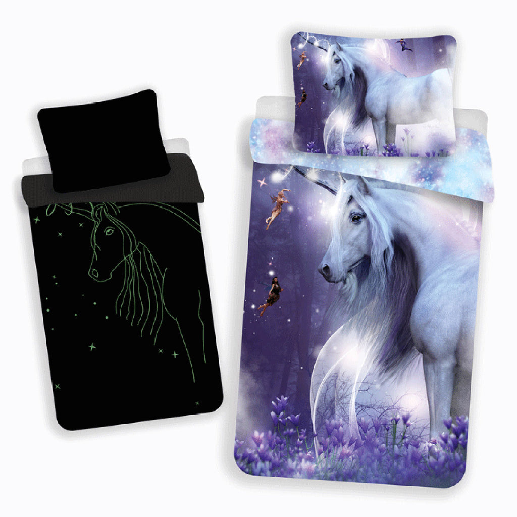 Tweezijdig Eenhoorn Dekbedovertrek. Het kinderovertrek is aan de ene kant bedrukt met een eenhoorn print en de andere kant heeft een magische kleurencombinatie van paars, blauw, roze en wit. De omlijning van de eenhoorn is ook zichtbaar in het donker dankzij het Glow in the Dark effect. Het dekbedovertrek is gemaakt van 100% katoen. Kussensloop: 70 x 90 centimeter, dekbed: 140 x 200 centimeter.
