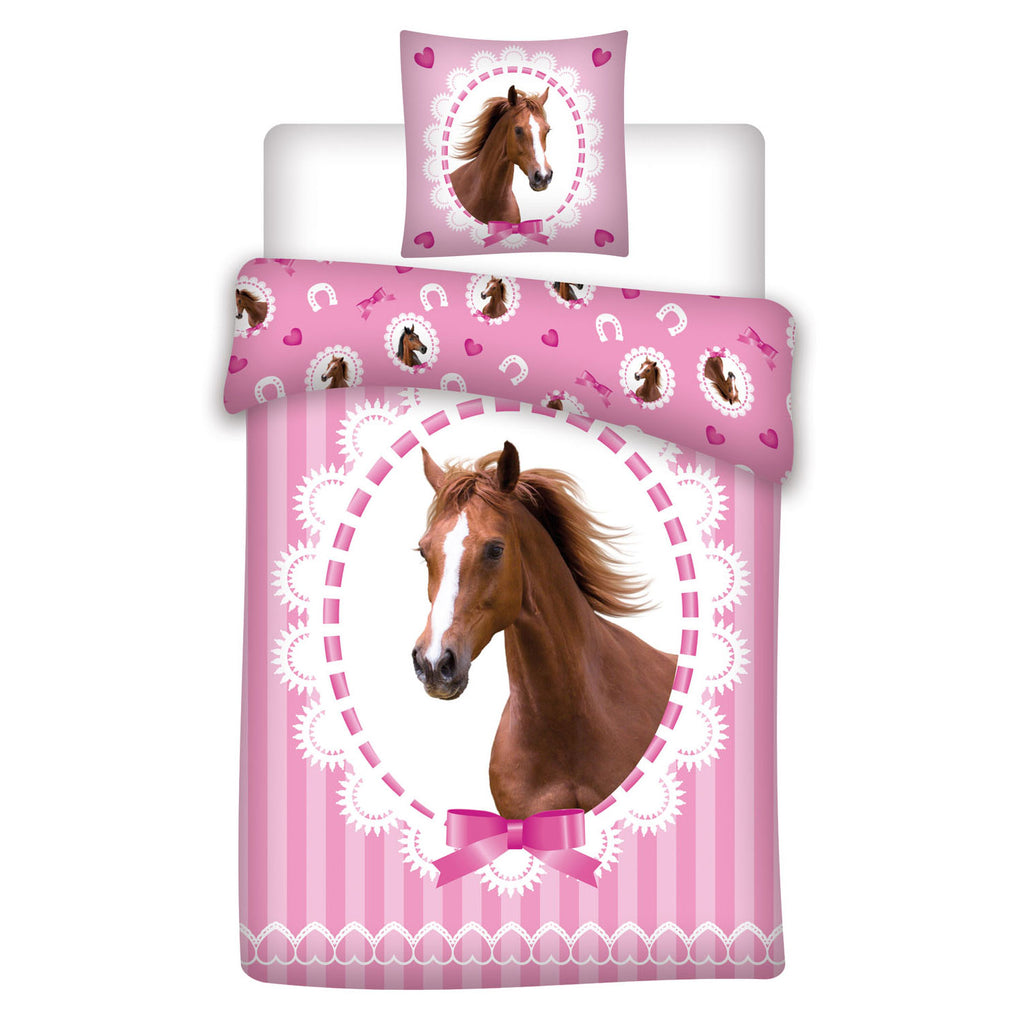 Op dit roze dekbedovertrek staat een mooie afbeelding van een paard! Het dekbedovertrek is 140 bij 200 centimeter.