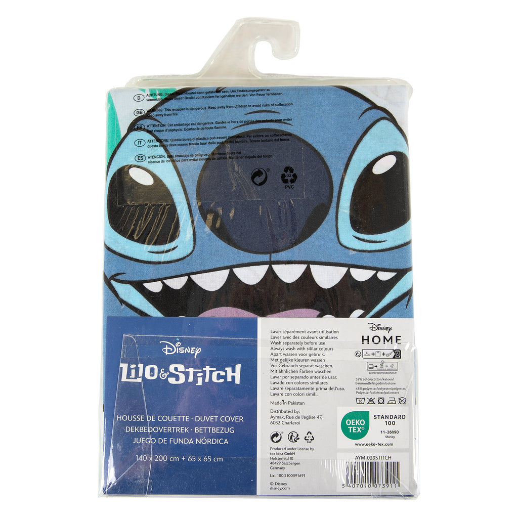 Dekbedovertrek met dubbelzijdige print van Stitch. Het dekbedovertrek is 1-persoons (140x200cm met een kussensloop van 65 x 65 centimeter). Gemaakt van polykatoen en geschikt om te wassen op 40 graden.