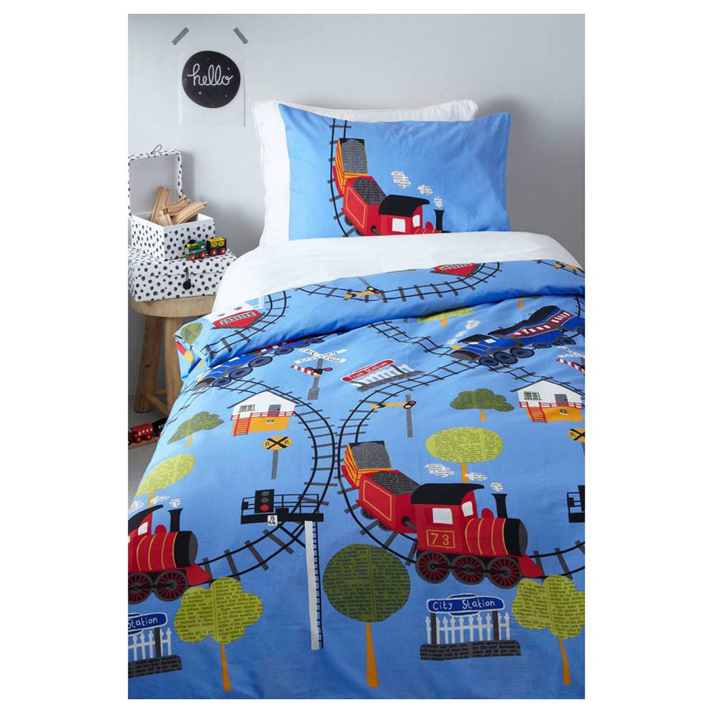 Onder dit trein dekbedovertrek slapen echte treinliefhebbers. Op dit katoenen dekbed zijn treinrails te zien waarop een blauwe en rode locomotief rijden met achter hen 2 wagons. Verder zijn er treinstations, bomen, spoorwegovergangen en huisjes op het dekbed te zien. Het dekbed is huidvriendelijk en heeft mooie kleuren die het beste behouden blijven door het gebruik van een goed fijnwasmiddel en een bonte was programma op 60 °C. De afmeting van het dekbed is 140 x 200 cm. Inclusief kussensloop.