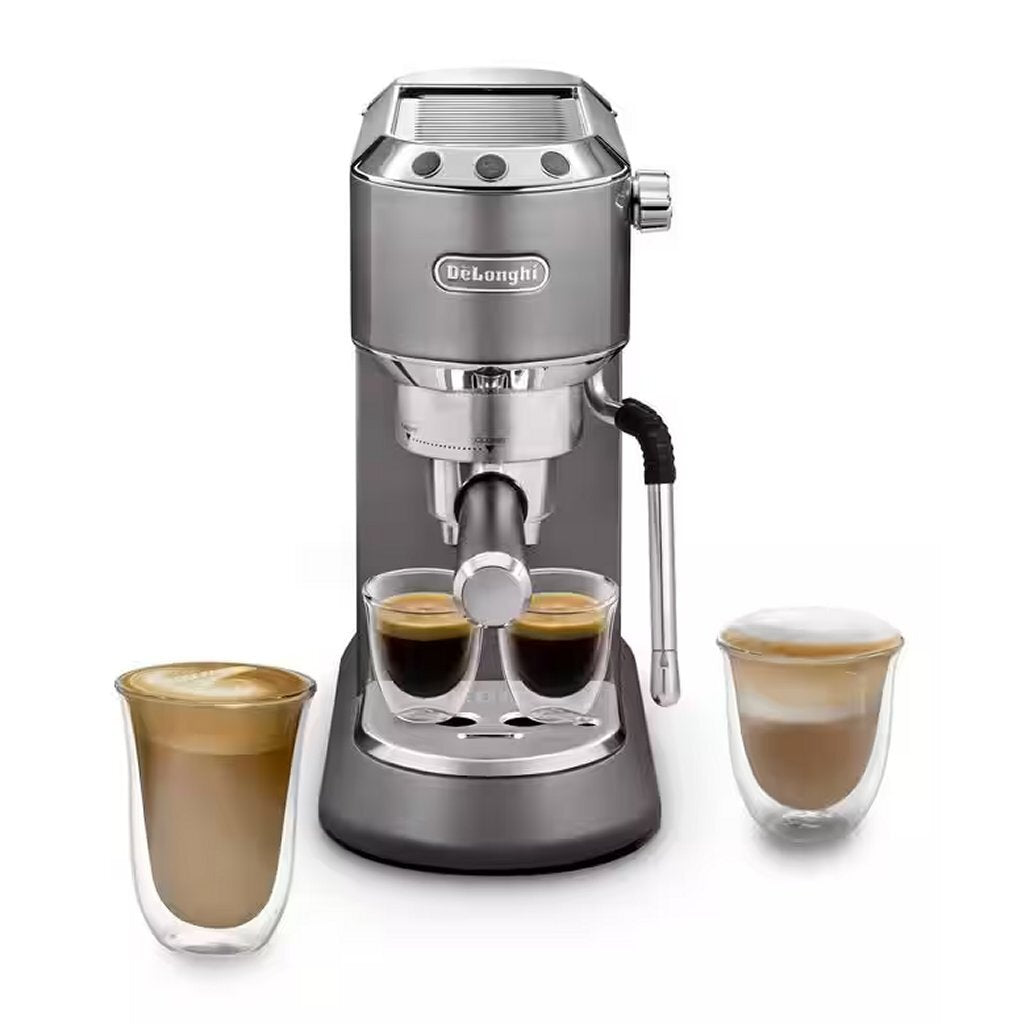 - Met slechts 15 cm breed is de uniek ontworpen Dedica onze smalste espressomachine tot nu toe, die moeiteloos een vleugje minimalistische elegantie toevoegt aan je keuken met zijn prachtige afmetingen. Het gestroomlijnde, compacte ontwerp wordt aangevuld door een gebruiksvriendelijk bedieningspaneel met verlichte knoppen.