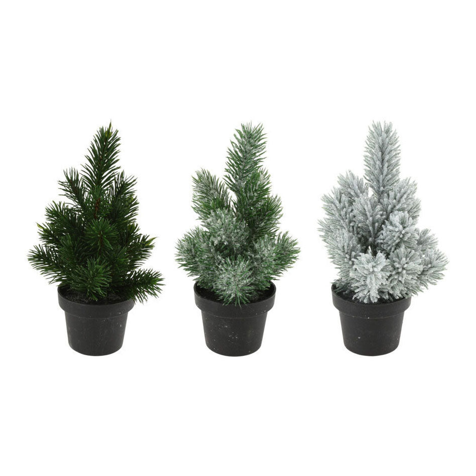 Kerstboompje in pot, 22 centimeter hoog en ca. 13 centimter breed. De kerstboom is op tafelformaat en verkrijgbaar in de varianten: groen, groen met glitter en besneeuwd.