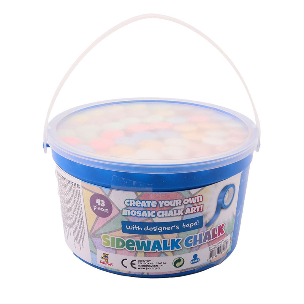 Stoepkrijgt met tape om designs te maken. Het tape is 25 meter lang, 3 cm breed en er zitten 43 stoepkrijtjes in de emmer.