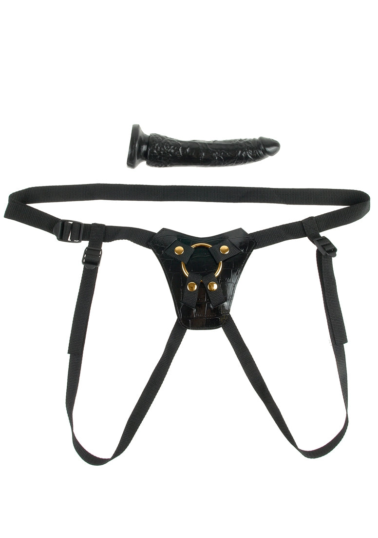 In grootte verstelbare band met afneembare dildo. Dildo in natuurlijke penis look met zuigvoet - kan ook solo en zelfs uit de vrije hand gebruikt worden. De band in edele slangenleer-look met goudkleurige details is in veel verschillende maten verstelbaar: Heupomvang tot 112 cm, dijbeenbanden elk tot 102 cm in omtrek.