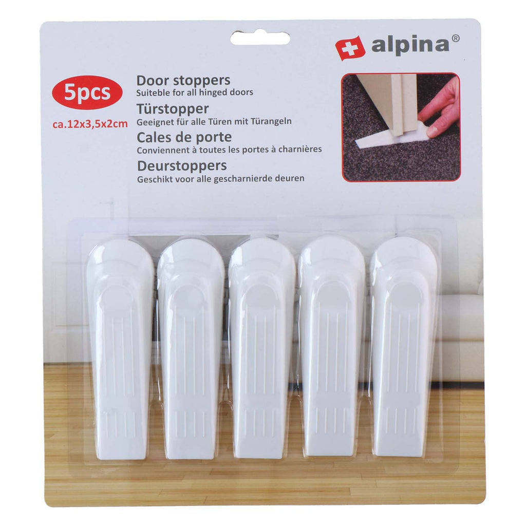 Set van 5 witte deurstoppers. Afmeting: ca. 12 x 3,5 x 2 cm
