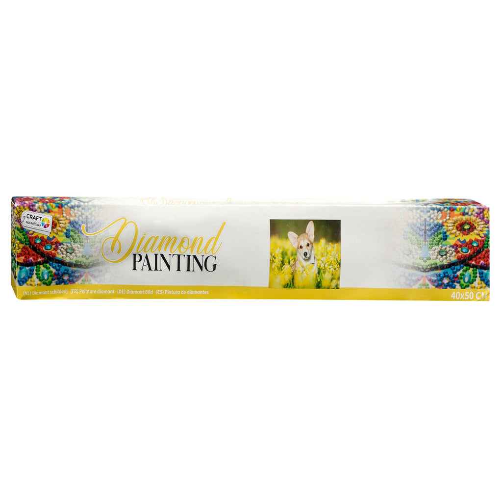 Diamond Painting Hond. Afmeting: 30x50 centimeter. Inclusief Diamond Painting pen, een wax blokje, en een schudbakje. Tip: rol het canvas direct uit en leg er iets zwaars op. Bij het painten blijven de steentjes dan beter plakken!