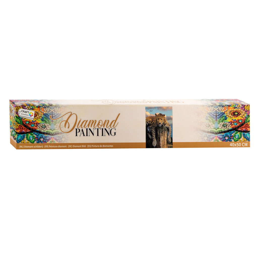 Diamantschilderij met afbeelding van een luipaard. Plak alle diamantjes op de juiste nummertjes. Afmeting: 50 bij 40 cm. Schilderijlijst niet inbegrepen.