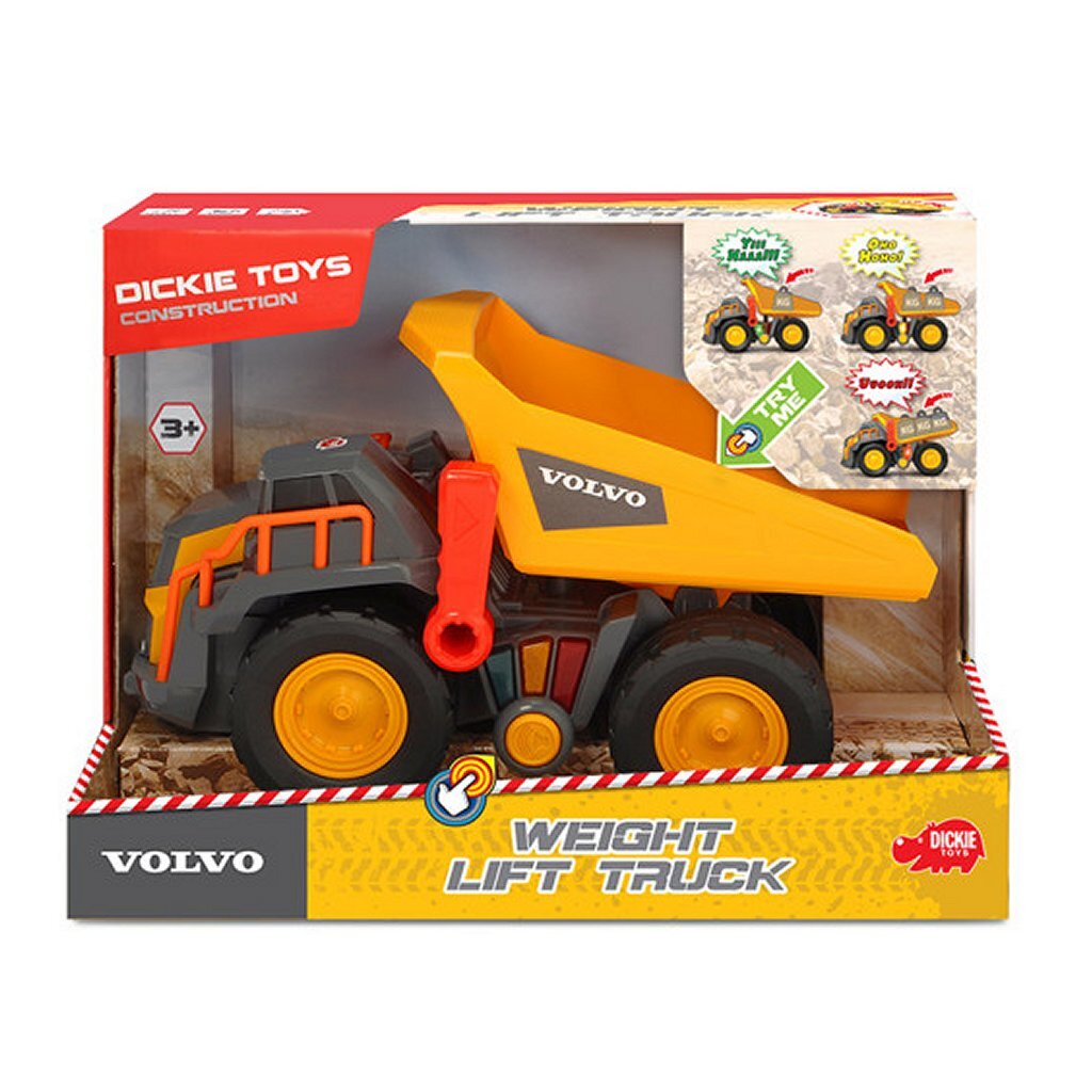 DezeDickie Toys Volvo kiepwagen is echt een aanwinst voor je bouwplaats! Rijd hem ernaartoe en vul de bak. De auto kan zelf detecteren of de inhoud licht, gemiddeld zwaar of erg zwaar is en laat dit zien met lichtjes en geluid. Rijd daarna naar je bestemming en laat de bak kiepen om je lading te dumpen! De wagen werkt op 2x AA/LR6 batterijen (inbegrepen). Geschikt voor kinderen vanaf 3 jaar.