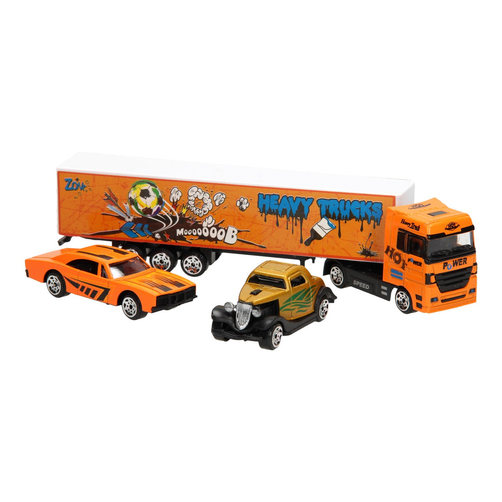 De oranje Die-Cast Vrachtwagenset bestaat uit een vrachtwagen en 2 speelgoedauto's: een oranje racewagen en een goudkleurige oldtimer. Welke race avonturen gaan de 3 voertuigen uit jouw Die-Cast Vrachtwagenset beleven? Schaal 1:87.