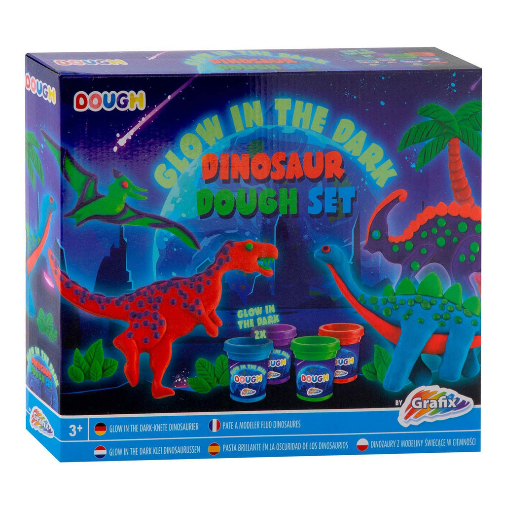 Dinosaurus Kleiset Glow in the Dark. In de set zitten vier potjes klei waarvan twee glow in the dark, vier vormpjes en een kleiroller.