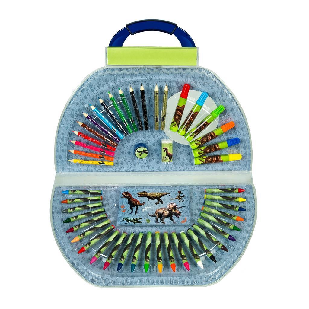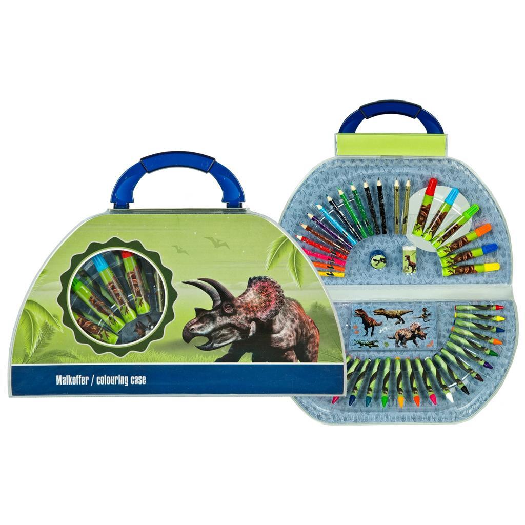 Dinosaurus kleurkoffer met 12 mini kleurpotloden, 6 stiften,24 wasco?s, 2 potloden, 4 kleurplaten, gum, puntenslijper, en1 stickervel. Geschikt voor kinderen vanaf 3 jaar.
