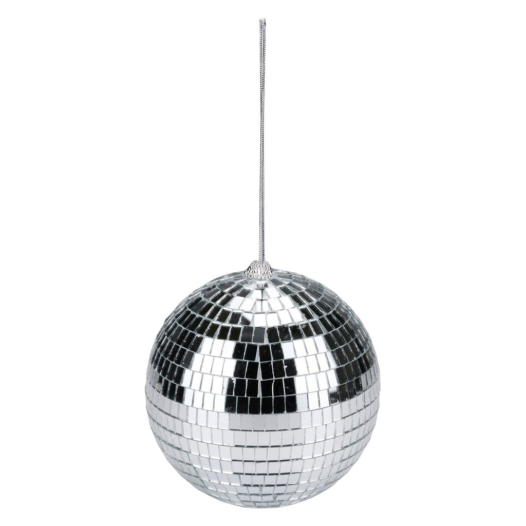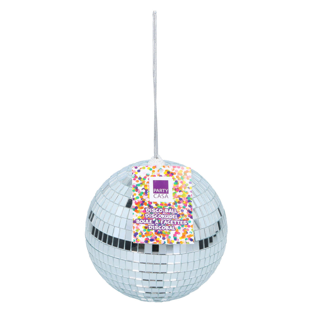 Discobal van 15 centimeter groot aan een zilverkleurig ophanglintje. Gemaakt van kunststof.