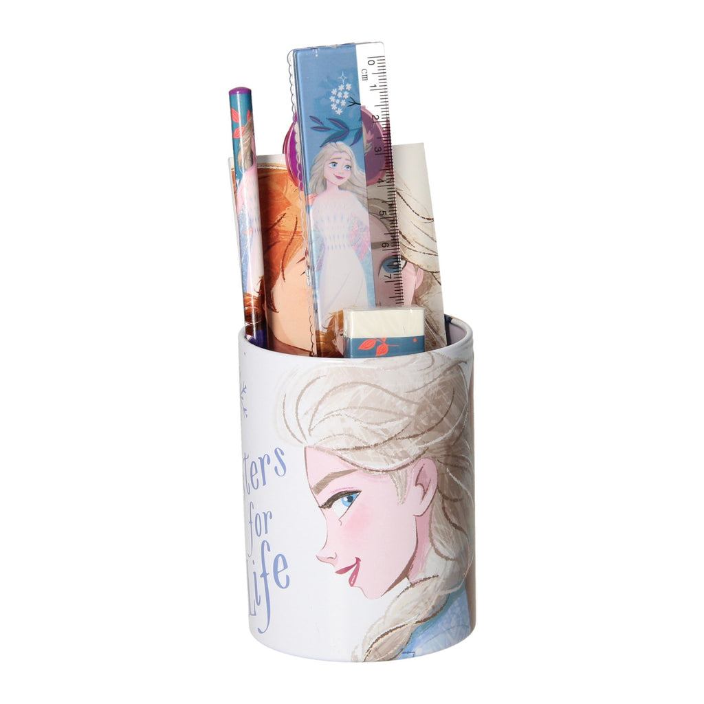 Bureauset in pennenhouder met o.a. een potlood, liniaal en puntenslijper in Frozen-thema. Geschikt voor kinderen vanaf 3 jaar oud.