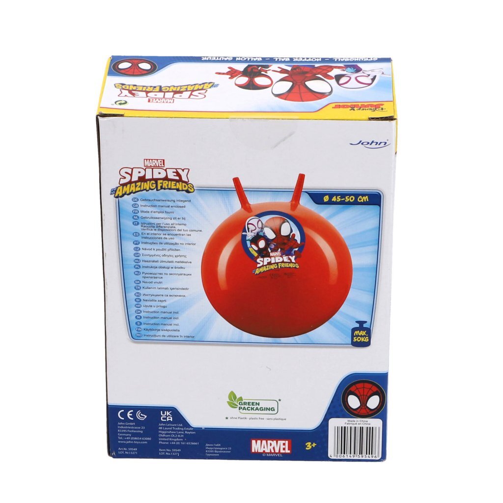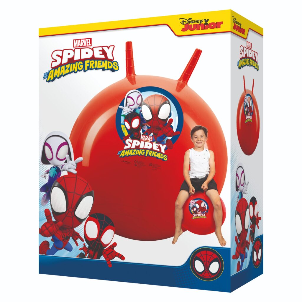 Rode skippybal met afbeelding van Spiderman, SpiderGwen en Miles Morales. Diameter: 50 cm. Geschikt voor kinderen vanaf 3 jaar.