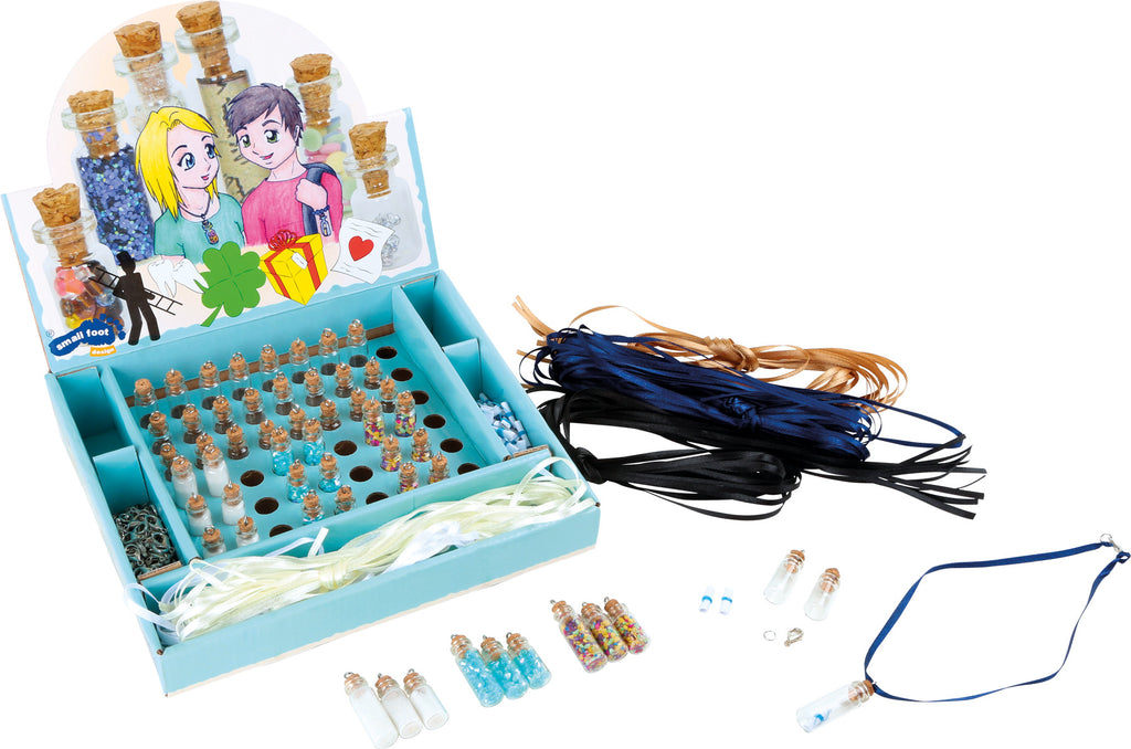 54 stuks. Deze kleine flesjes zijn een nieuwe trend om uw individuele juwelen accessoires te maken. Ze kunnen gevuld worden met zand van uw laatste vakantie of ze kunnen uw melktanden bewaren. De verschillend gekleurde satijnen linten kunnen zowel als halsketting of als armband gebruikt worden. Er is een klein juwelenklikhaakje dat gemakkelijk aan het lint en de fles kan worden bevestigd. Een echte blikvanger!