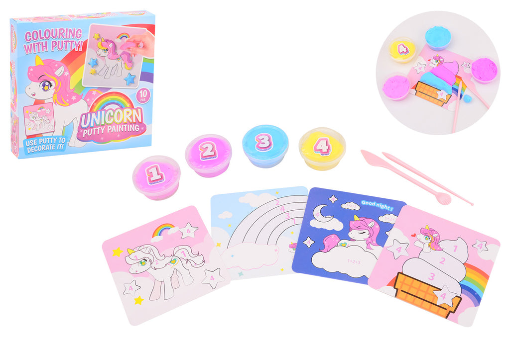 De set bevat 4 kaartjes met afbeeldingen, 2 tools en 4 kleuren putty. Geschikt voor kinderen vanaf 3 jaar.