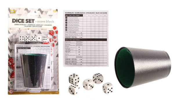 Dobbelset bestaande uit een kunstlederen pokerbeker met groen vilt binnenwerk. Inclusief 6 dobbelstenen - 16mm en een scoreblok.