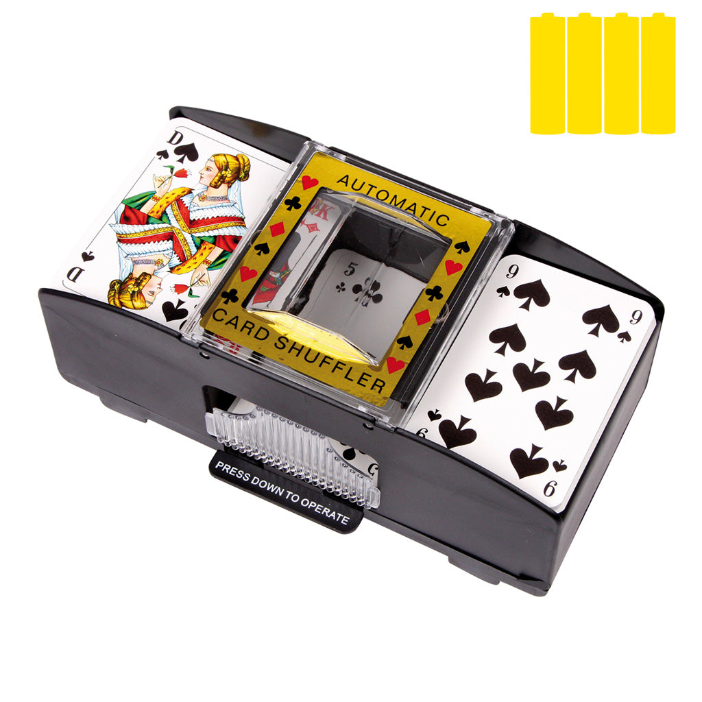 De kaartschudder wordt aangedreven door vier meegeleverde AA-batterijen, zodat je onmiddellijk na ontvangst kunt beginnen met spelen. De batterijen zijn eenvoudig te vervangen, waardoor de kaartschudder altijd klaar is voor het volgende spel.