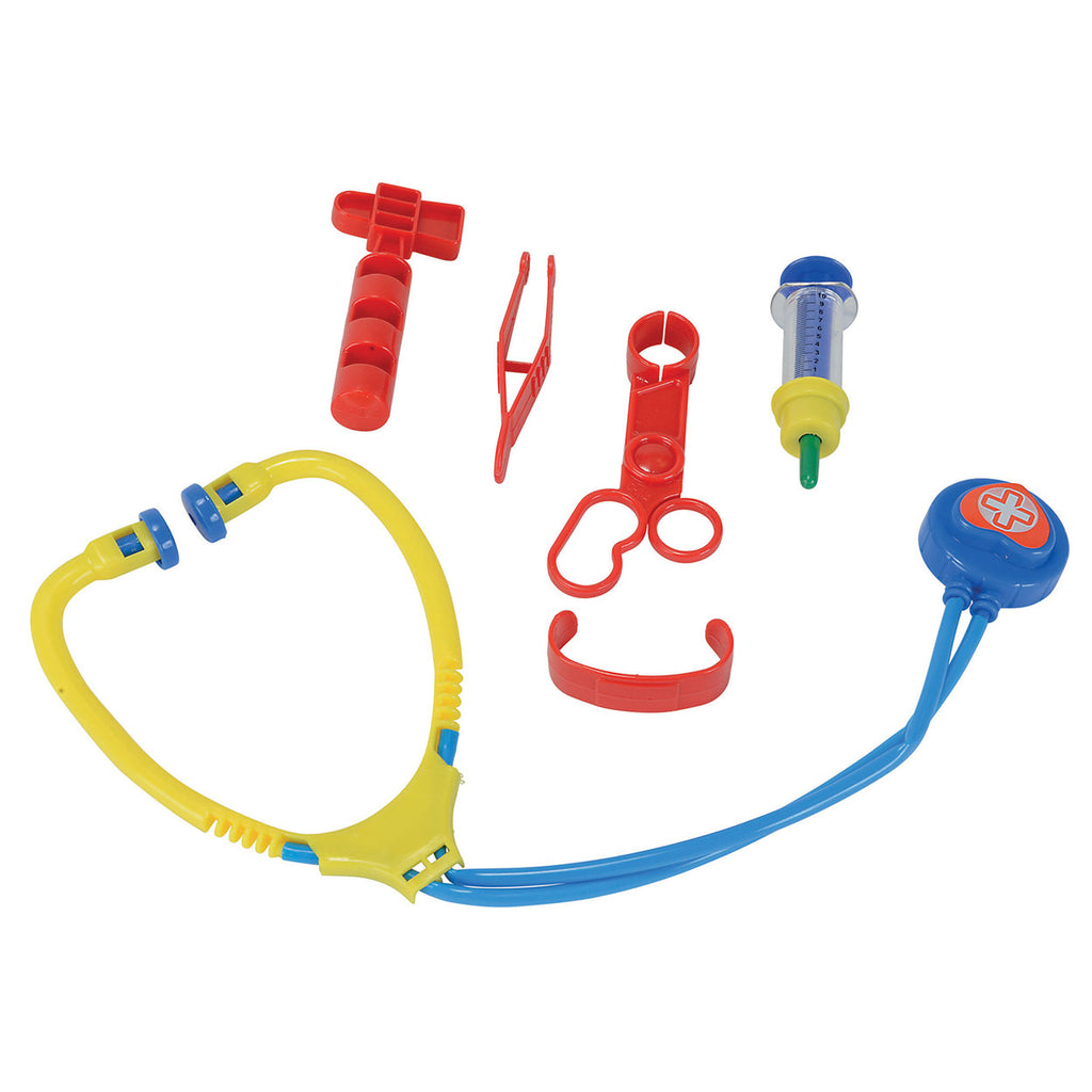 Jij bent de dokter! Maak al je vriendjes weer beter met deze mooie transparante dokterskoffer met stethoscoop, pincet, plijsterspuit en hamertje.