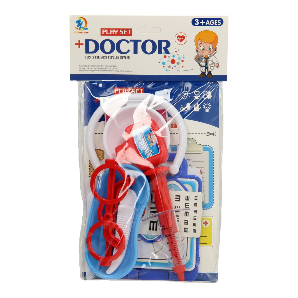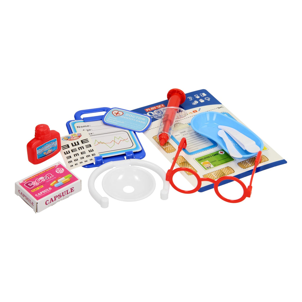 Doktertje spelen. Het is en blijft leuk! Dit Dokterssetje bestaat uit 11 delen, waaronder een spuit, naambordje, pleisters, desinfectieflesje en brilletje. Sommige onderdelen zijn gemaakt van kunststof, andere onderdelen van het Dokterssetje kun je uitknippen uit karton.