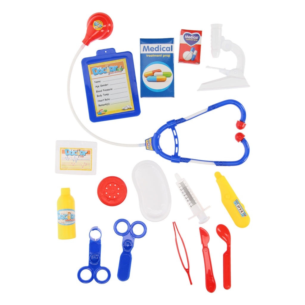 Waan je een echte dokter met deze uitgebreide blauwe dokterskoffer. Is één van je dierenknuffels of poppen ziek? Pak je dokterskoffer erbij en begin met onderzoeken. Kijk in het oor of meet de hartslag. In de koffer zit o.a. een stethoscoop, een otoscoop, een spuit, een brilletje en een schaar. De set is gemaakt van kunststof in blauw/geel/rode kleuren.