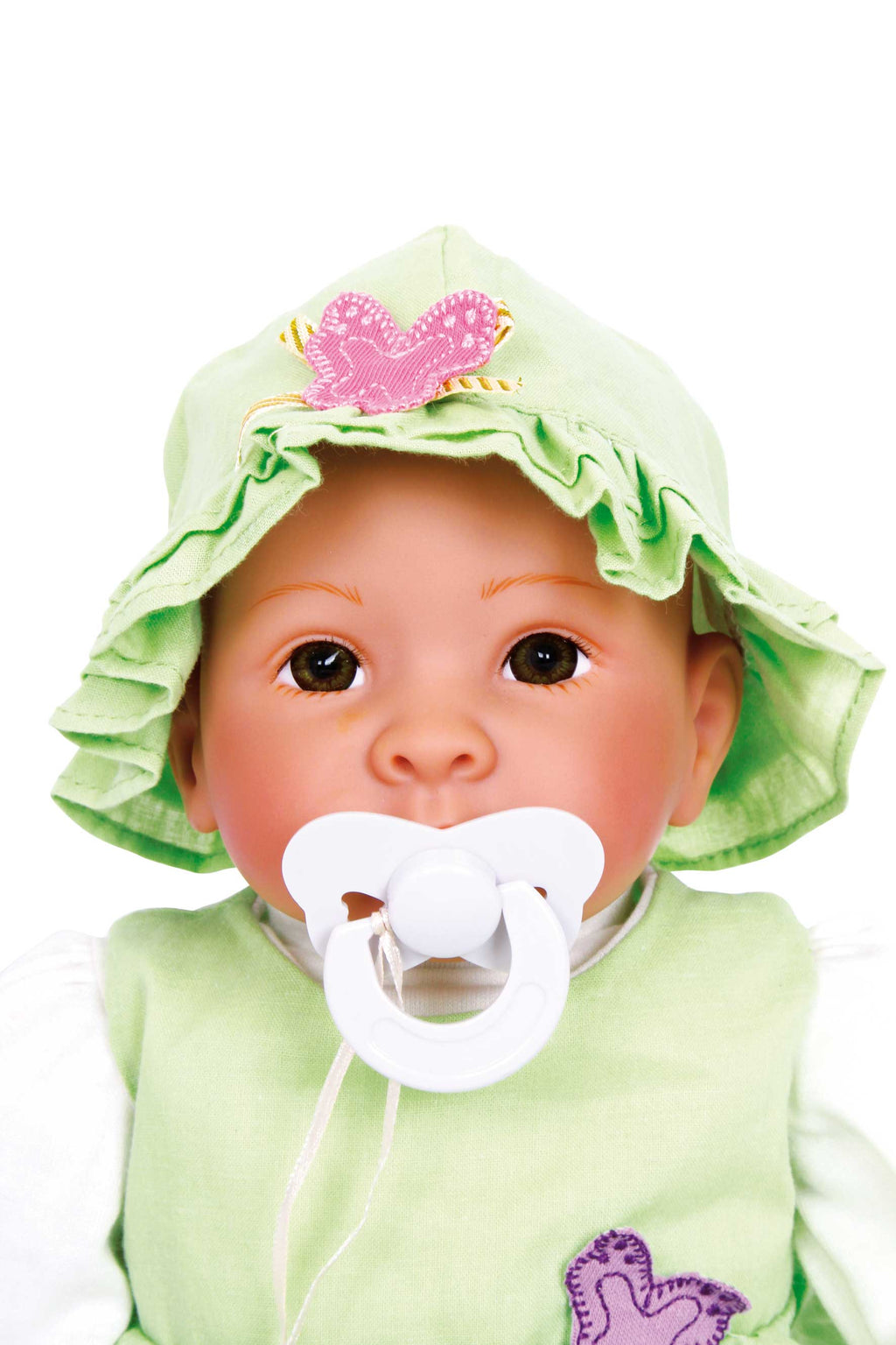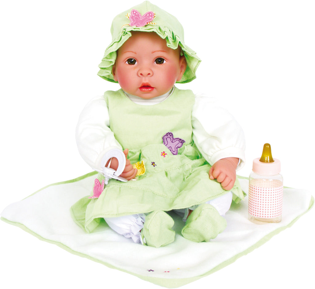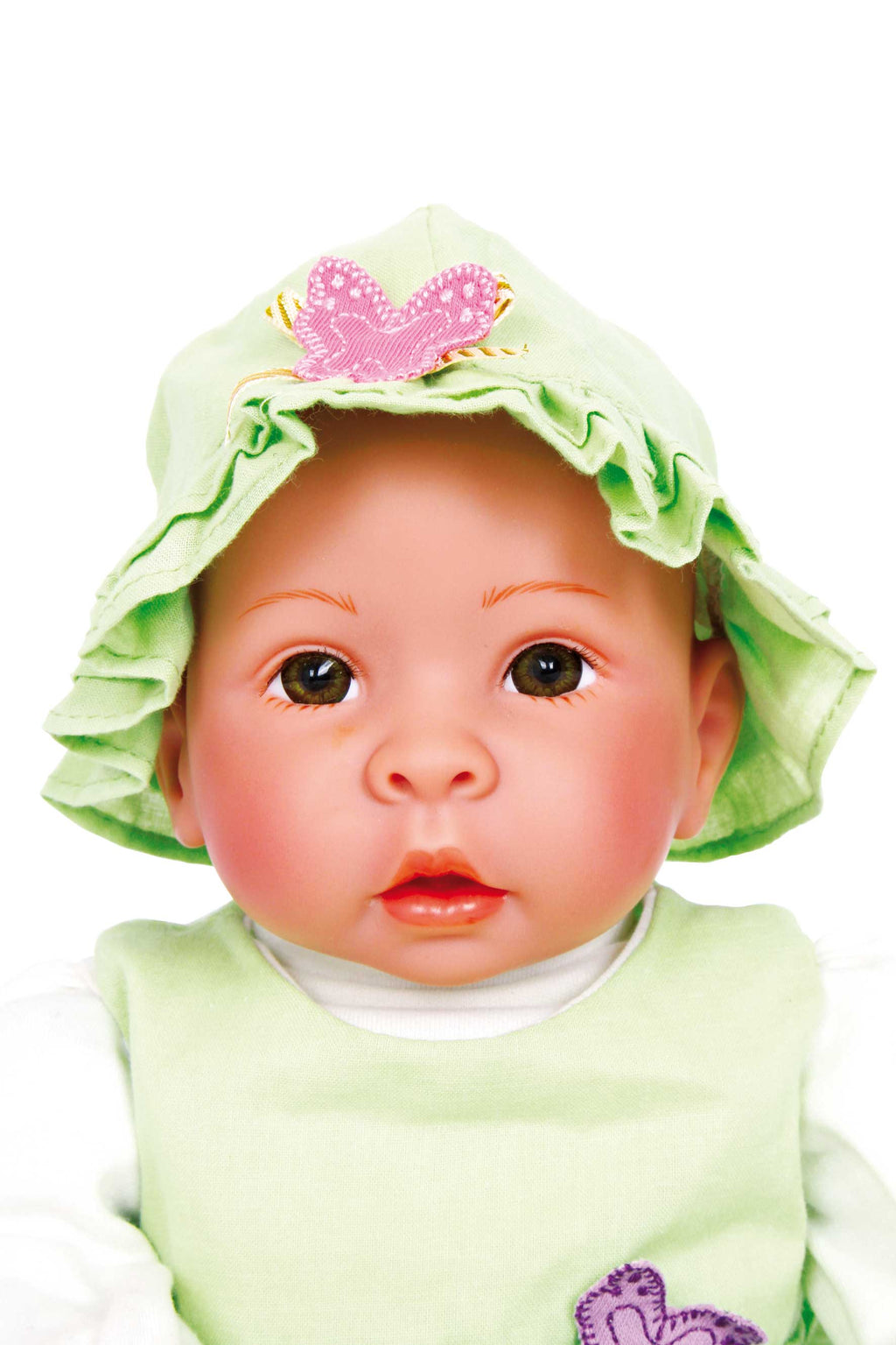 Dit kleine meisje brengt de zomer mee - de pop Karen ziet er heel schattig uit in haar mintgroene jurk. De beweegbare armen en benen maken de baby een perfect stuk speelgoed voor kleine poppenmoeders Met haar zuigfles en een uitgestrekte duim om op te zuigen, wordt kleine Karen goed verzorgd. De transparante glaselementen en de vastgelijmde wimpers brengen levendigheid in de ogen van de pop. Deze zachte pop draagt een limoengroene jurk met een stijlvolle hoed en een knuffeldoekje.