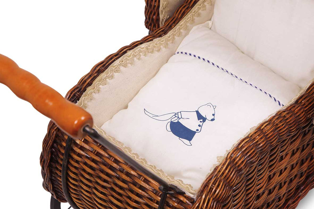 Prachtige kinderwagen van vlechtwerk voor veeleisende poppenmoeders of als leuke decoratie. Zachte deken en kussen met lieve motieven. Het metalen frame en de spatborden in een geoxideerd design versterken de flair van weleer! De met rubber beklede wielen zorgen voor stille loopgeluiden.