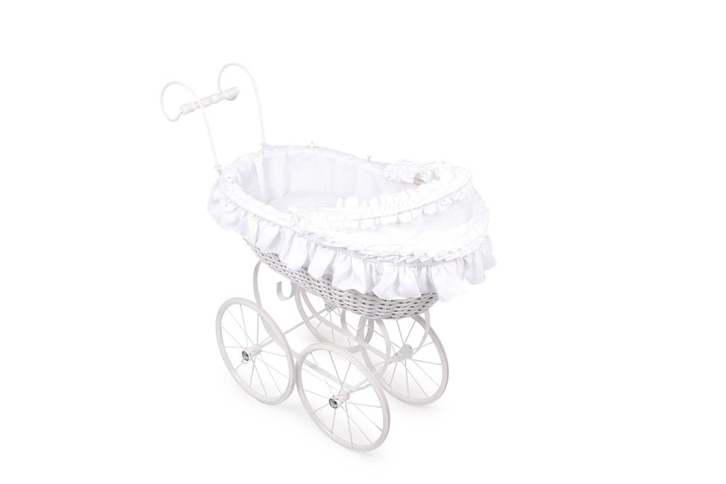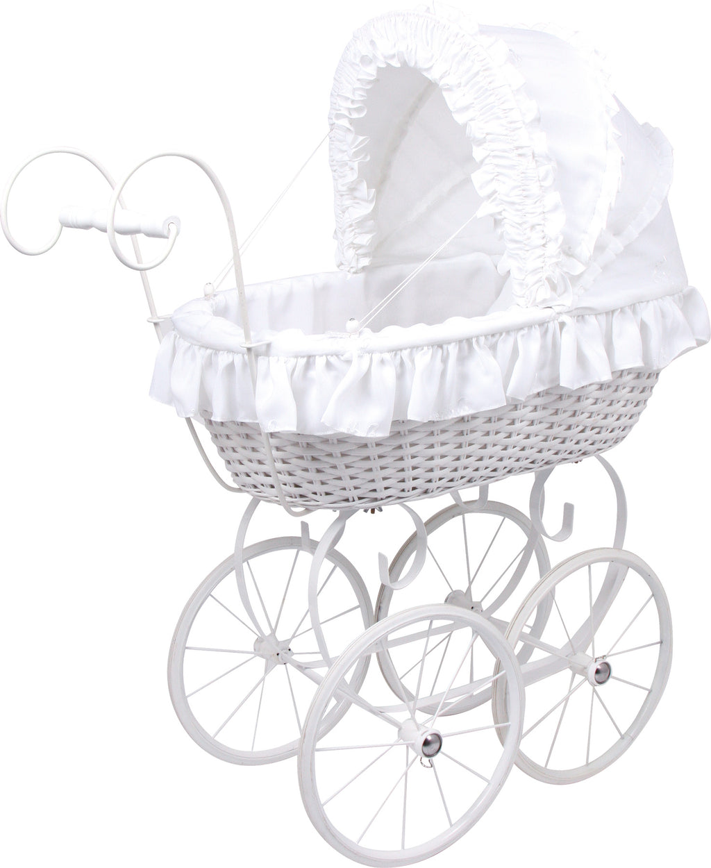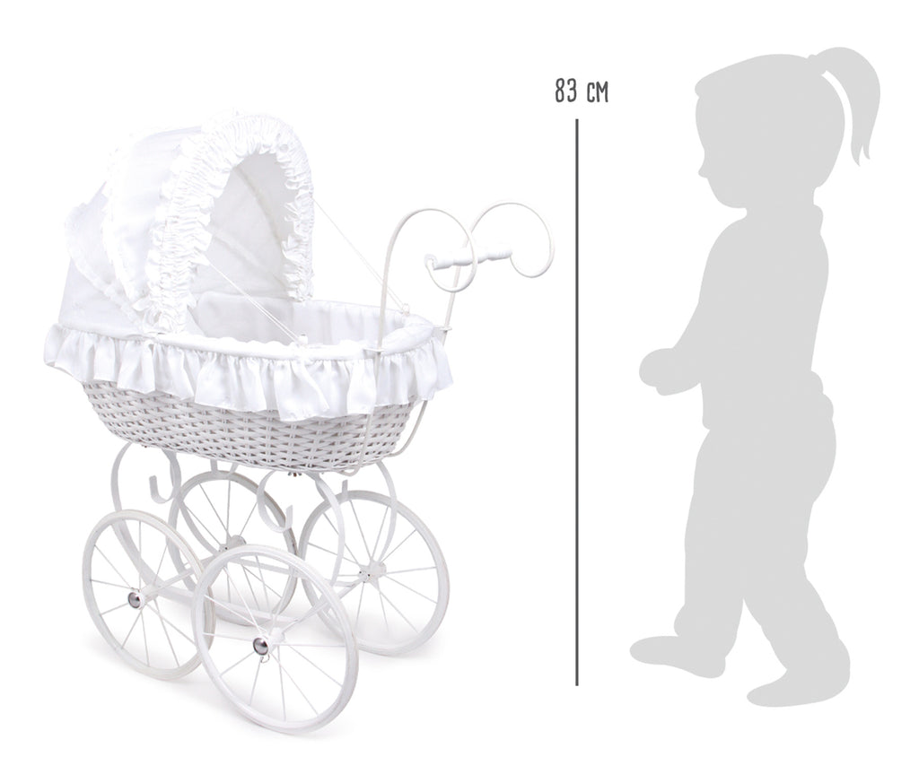 Deze stralend witte kinderwagen met metalen rekje, rotan vlechtwerk en verschillende stoffen is een must-have voor elke poppenmoeder! De opvouwbare kap met zijn mooie borduursels en betoverende franje kan worden vergrendeld en rondt het geweldige ontwerp van deze elegante kinderwagen af. De met rubber beklede wielen zorgen voor een stille loop.