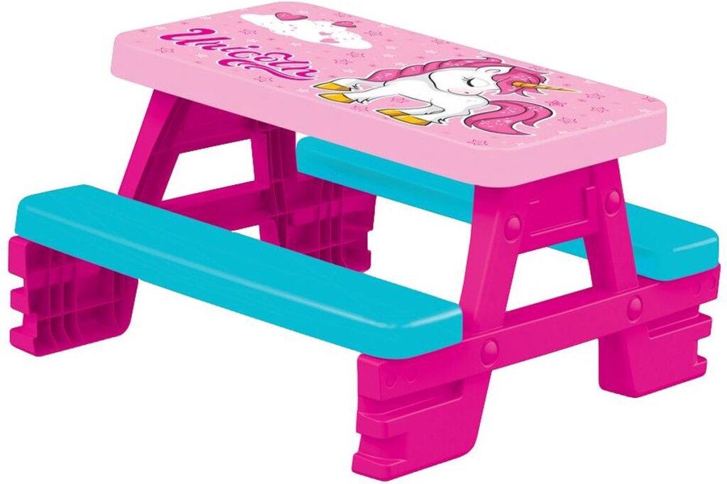 Je kindje zal altijd zijn of eigen zitplekje hebben met deze Dolu picknicktafel! De tafel is lekker girly en is roze van kleur met een mooie unicorn print.De picknicktafel heeft plek voor vier kindjes. Hij is ideaal om een hapje aan te eten, te knutselen of lekker buiten te spelen.De picknicktafel is gemaakt van stevig kunstof, waardoor hij geschikt is voor zowel binnen als buiten gebruik. Hij is geschikt voor kindjes vanaf 2 jaar, veel plezier!Eigenschappen: