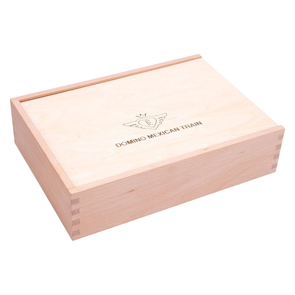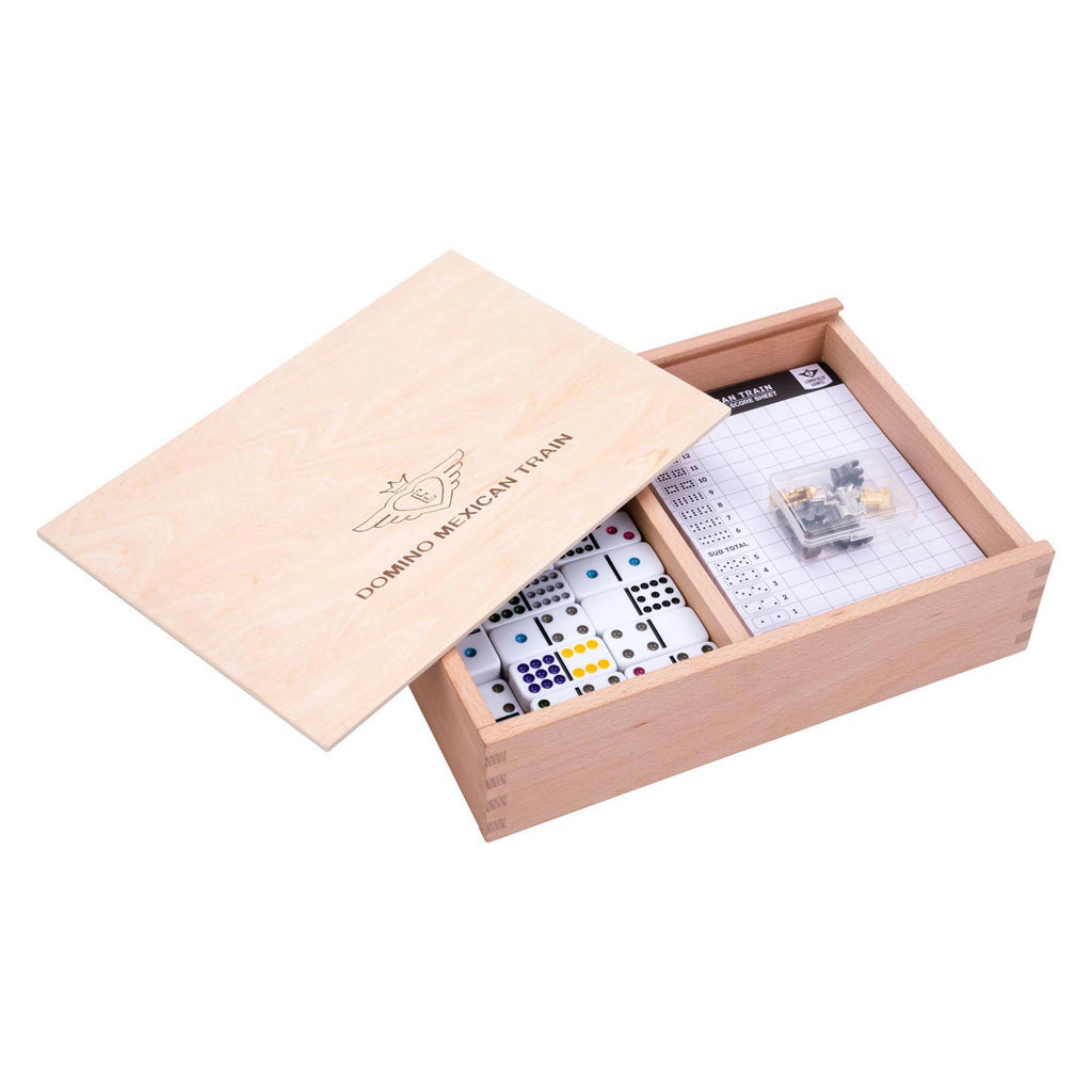 De Domino Mexican Train D12 Deluxe is inclusief scoreblok, houten station en metalen treintjes. Het aantal op de stenen gaat tot 12. Het spel bevat 91 dominostenen en wordt geleverd in een beuken houten kist.