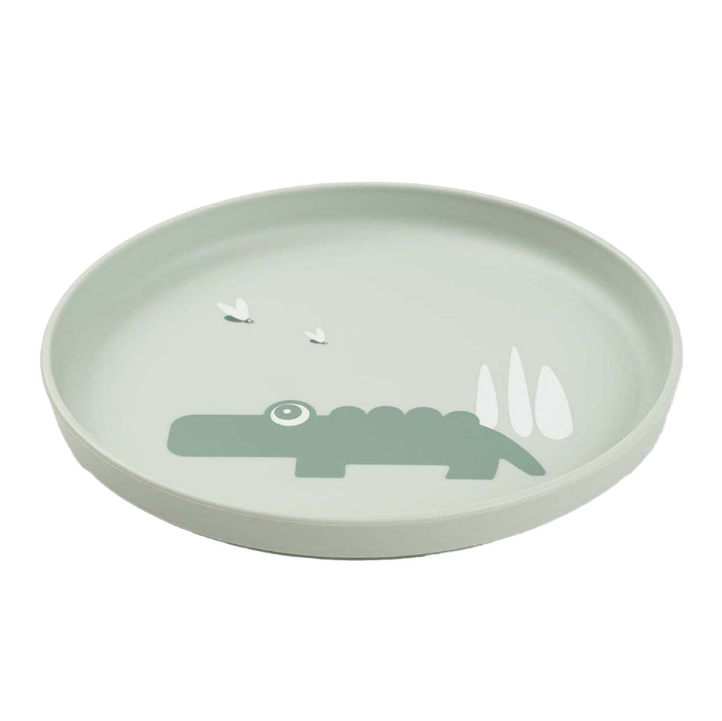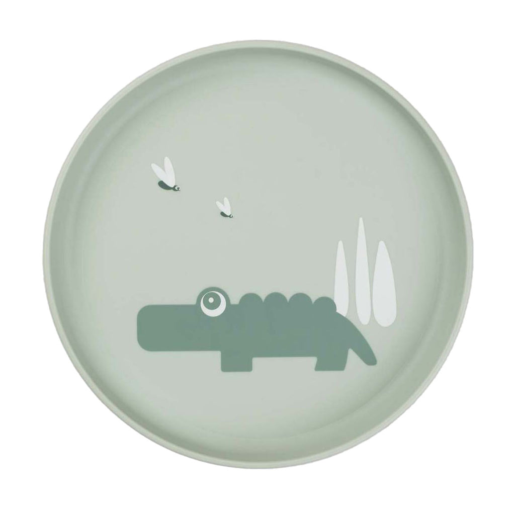 Het groene bord is bedrukt met een cool motief van de hartelijke krokodil Croco die naar een paar vuurvliegjes staart. Croco's nieuwsgierigheid zal uw kind inspireren om het eten op het bord te verkennen. Het donkerdere groen van de basis voegt een leuk tweekleurig detail toe.
