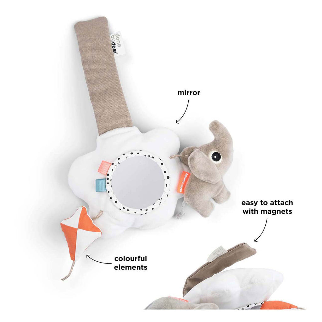 Deze leuke kinderwagenmobiel houdt je kleintje bezig en vermaakt zich onderweg. Met Elphee, de vlieger en een spiegel voor leuke reflecties, trekt het de aandacht van je baby en wekt het nieuwsgierigheid.